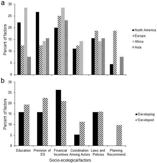 The grouping of continental locations into developing and developed regions revealed that Financial Incentives was more commonly discussed in articles from developing regions whereas Education, the Provision of Ecosystem Services, Coordination Among Actors, and Planning Recommendations were more commonly discussed in articles from developed regions (Figure 3b). In order of decreasing prevalence, Financial Incentives and Laws and Policies, the Provision of Ecosystem Services, and Education, which were equally prevalent, were the most common factors described by articles from developing regions whereas the Provision of Ecosystem Services, Financial Incentives, and Education were the most common factors described by articles from developed regions.