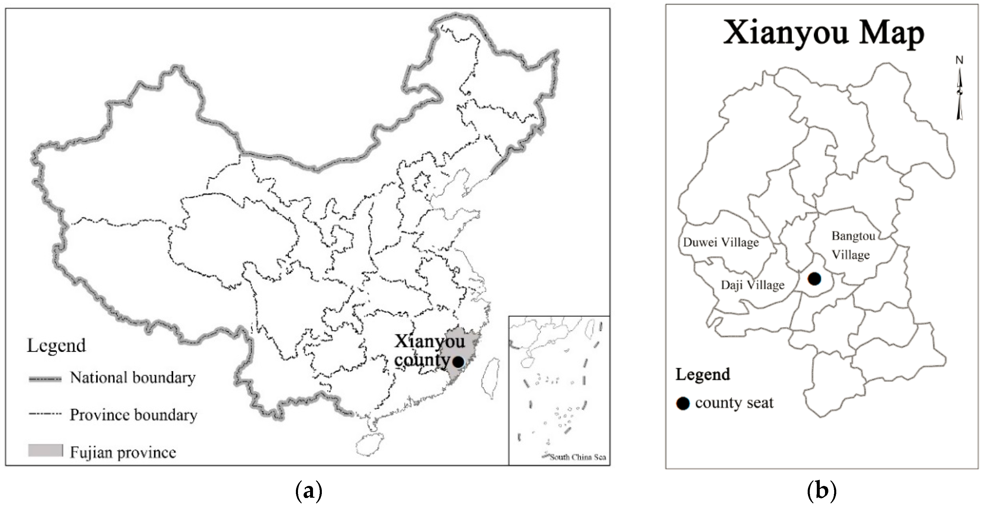 Geographical location of Xianyou County, China. (a) Location of Xianyou in China; (b) Main towns in Xianyou AFM cluster.