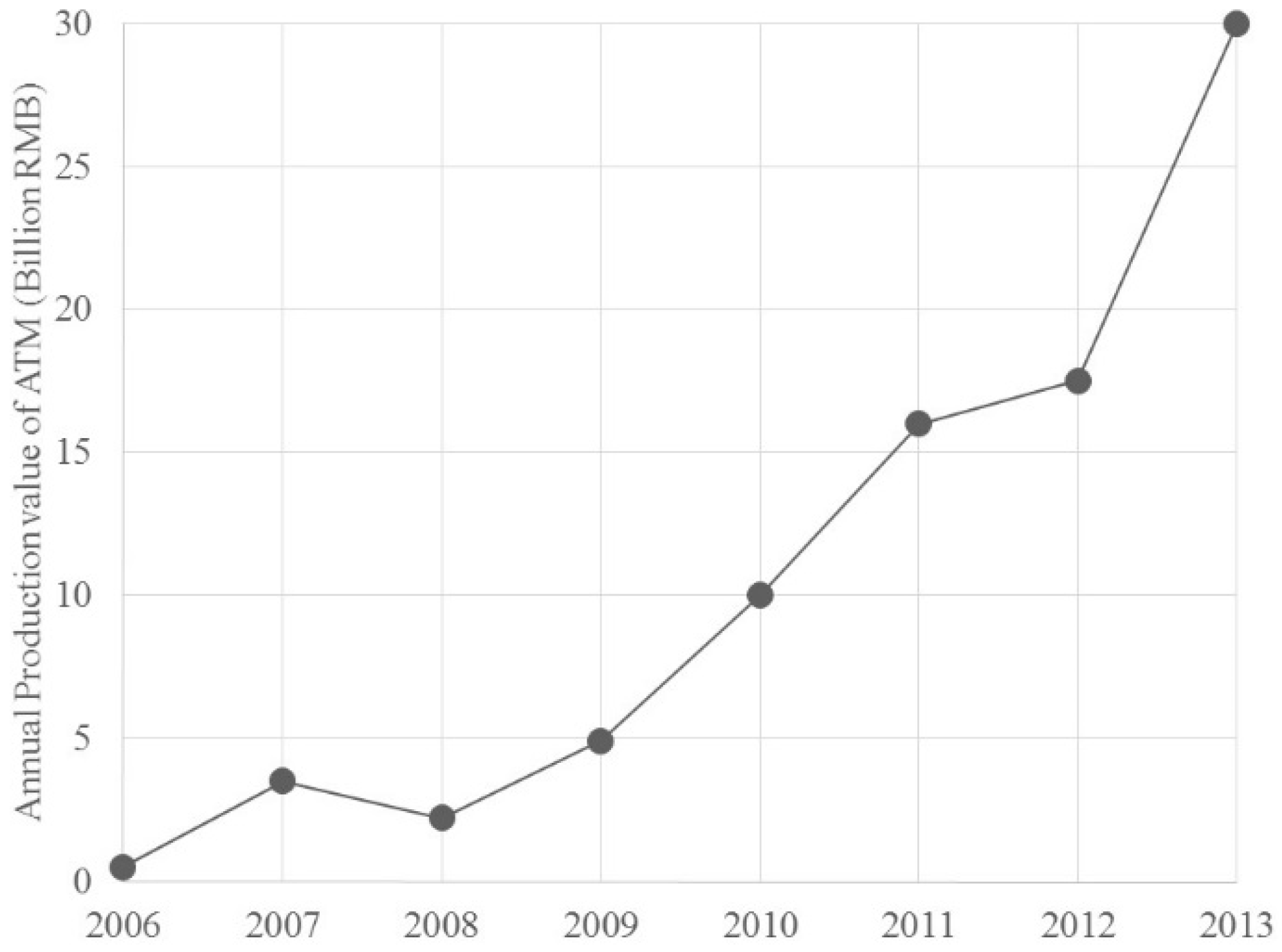 Annual production of the Xianyou ATM industry, 2006–2013 (units in billions of RMB). Source: Xianyou County Statistics Division (2007–2014).