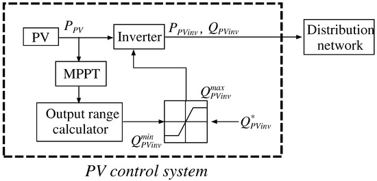In this paper, the DGs considered are based on PV generators, which are the most popular in smart houses. PV output is controlled using the MPPT algorithm because the PV output may be changed by the weather conditions. It is also known that the maximum power output point characteristic fluctuates from moment to moment. Otherwise, the reactive power outputs from the inverters interfacing with the DGs are used to control the distribution system voltage as a cooperative operation. It is unnecessary to install additional control devices when using the PV inverter margin. Thus, the limit of the reactive power supply depends on the PV active power output [11]. The reactive power control scheme is shown in Figure 2.