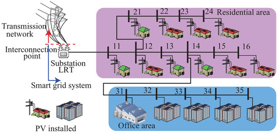 In this research, a common type of radial distribution system is used, as shown in Figure 4, in order to verify the effects of the BESS and the active smart grid system. Each system model is represented as shown in the section of the case studies. PV generation systems are installed for more than half of the customers: the simulated output of one of these is shown in Figure 5a. In order to simplify the analysis, the forecast error of PV output and load demand is not assumed. The customers comprise two areas. One of these areas is a residential area; the other is an office area. Their load usage is completely different, as shown in Figure 5b. A high penetration of DGs is assumed in this research. From these loads and the amount of PV output, voltage deviation and reverse power flow are caused without control. The BESS capacity standard is shown in Table 1.