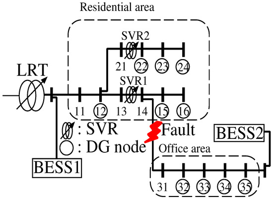 - BESS 1 is installed at the interconnection point to protect the upper high voltage system from reverse power flow. BESS 2 is installed in a branched office area as an emergency energy storage. In this case, BESS management is simulated in two modes of operation: operation Mode 1 is normal operation without a fault. On the other hand, when a disconnection fault occurs in the office area of Figure 6, islanding is applied by using BESS 2 as a power supply. As control devices for active and reactive power supply, BESS 1, BESS 2, LRT, SVR, SVC and inverters interfacing with the PVs are used. The results of each mode in Case 1 are provided in Figure 7 and Figure 8.