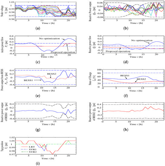 Figure 7. Simulation results of Case 1 without fault (operation Mode 1); all control devices’ operations are listed as: (a) node voltage; (b) reactive power output by inverters interfacing the PV; (c) active power flow at the interconnection point; (d) reactive power flow at the interconnection point; (e) active power output of each large BESS; (f) states of charge of each large BESS; (g) reactive power output of BESS 1; (h) reactive power output of BESS 2; and (i) tap positions of the LRTs and SVRs.