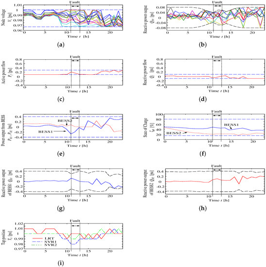 Figure 8. Simulation results during fault in Case 1: (a) node voltage; (b) reactive power output of inverters interfacing the PVs; (c) active power flow at the interconnection point; (d) reactive power flow at the interconnection point; (e) active power output of each large BESS; (f) states of charge of each large BESS; (g) reactive power output of BESS1; (h) reactive power output of BESS2; and (i) tap positions of LRT and SVRs. - Case 2: