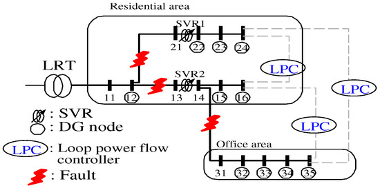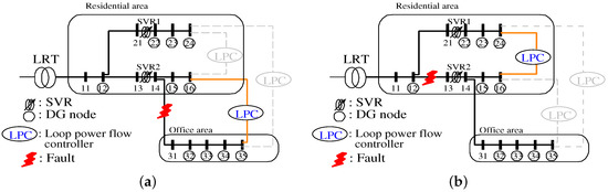 - In this case, LPCs are installed instead of BESSs in a fault situation. Moreover, the home BESS is introduced in DG nodes to supply reactive power. A three line disconnection fault will be considered. The fault locations and some examples of active smart grid configurations are shown in Figure 9 and Figure 10, respectively. The comparison of active smart grid is presented as Figure 11, Figure 12, and Table 3. To note this case, LPCs run only in fault conditions.