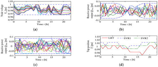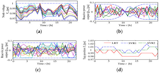 Figure 11. Simulation results of Case 2 (0): (a) node voltages; (b) reactive power outputs from interfacing inverter of the PV; (c) reactive power output by demand response; and (d) tap positions of LRT and SVRs.