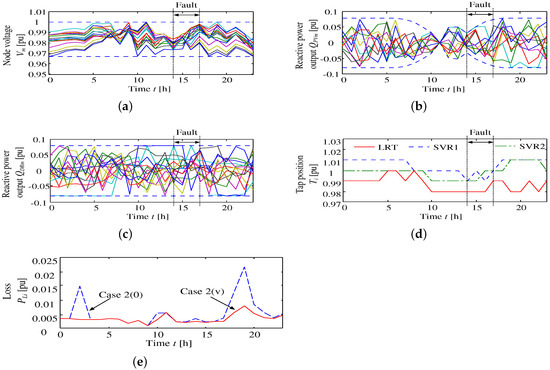 Figure 12. Simulation results considering a line fault in Case 2 (v): (a) node voltages; (b) reactive power output from the inverter interfacing the PV; (c) reactive power output by demand response; (d) tap position of LRT and SVRs; and (e) comparison of distribution losses.