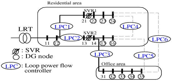 - The six LPCs are installed in the smart grid system as shown in Figure 13. Case 3 is different from Case 2 in that the system configuration will be changed in real time as a one-hour step. A reconfiguration operation of the active smart grid is optimized to minimize distribution losses. In order to solve the complex optimization including CP, a dual scheduling method is applied to the system.