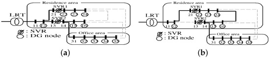 The second operation is shown in Figure 8. The result of operation Mode 1 shows the minimum SOC of the BESS at 11 o’clock in Figure 7f. In order to consider strict conditions, a disconnection accident of the distribution line occurs at 11 o’clock, and the fault continues for 3 h. The disconnection accident occurs between Nodes 14 and 31. During the fault, the office area is disconnected from the main distribution line, and power is supplied by BESS 2 as an emergency source assuming isolated operation. The fault simulation result of Case 1 is shown in Figure 8. From the results, it can be confirmed that all values and constraints are maintained within the proper range. Especially, node voltages are representative of the prevention of local outages in the office area. Moreover, it has been made possible to supply energy by using BESS 2 and PV output without changes in load demand consumption for the isolated operation term. The reactive power of BESSs 1 and 2 and the PV inverter output are used for voltage control. Tap control of LRT and SVR is also provided for voltage control. It was possible to avoid reverse power flow, as seen in Figure 8d.