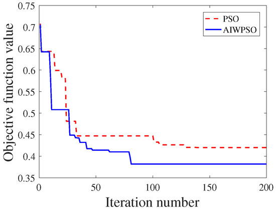 Swarm acceleration is adjusted by the adaptive inertia function. As the objective function value improves, the AIW value becomes smaller. This way, the AIW function helps to find a more accurate solution than the conventional PSO method.