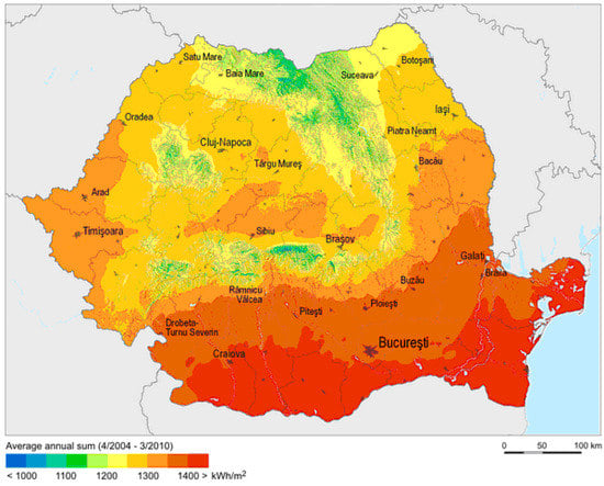 Rural population of Romania was approximately 46% of the Romanian population in 2011 [11]. This percentage reveals the potential of replacing the conventional water heating systems with solar systems in rural areas. Romania has a great potential of solar energy, as shown in Figure 1.
