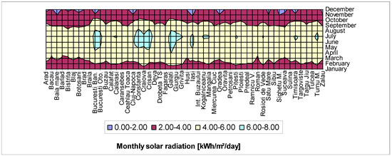 Average monthly global irradiation received on a horizontal plane in Romania [12].