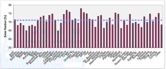 The solar fraction f is defined as the ratio of the useful solar energy supplied by the system and the energy required for heating water. Figure 4 presents the average annual solar fraction of SWH system for the locations analysed and considering a constant load profile. The average annual solar fraction for all the cities in Romania varies in the range of 64%–78% for a tilt angle of 45°.