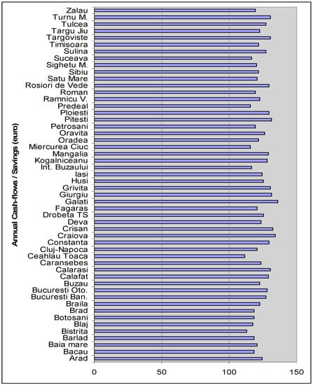 The cash flows represent the savings obtained by using SWH system comparing with the classic electric systems of heating water. These savings for each city are presented in Figure 7. The savings are referred to the costs of replaced energy (electricity), and were considered constant on the forecasting period that is the lifespan of the SWH system.