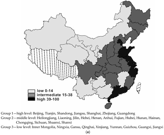 To visualize the three peaks of the stochastic kernel better, in Figure 8, the Chinese regions are clustered into three groups according to their average scores and average changing levels of the CIRD. Here, the regions are grouped by the default algorithm of Natural Breaks in terms of their grades of average CIRD values and average changes. Quoted from the GIS dictionary, the algorithm of Natural Breaks classifies data on the basis of “natural groups in the data distribution”, which are presented as “the low points of valleys” in the histogram—for example, the first group by Natural Breaks is allocated at “the largest valley”. The three groups benchmarked by the regional CIRD levels are as follows: one in the low socioeconomic status, ranging from 0 to 14 of the average CIRD grades; one in the middle level of socioeconomic status, ranging from 15 to 38 of the grades; and one in the high socioeconomic status, ranging from 39 to 100 of the grades. The three groups benchmarked by the regional CIRD changes are as follows: one grows slowly in the regional socioeconomic development, scored from 0 to 29 in the average changes of CIRD; one grows in an average rate, scored from 30 to 69 in the average changes; and one grows fast in the regional socioeconomic development, scored from 70 to 100 in the average changes.