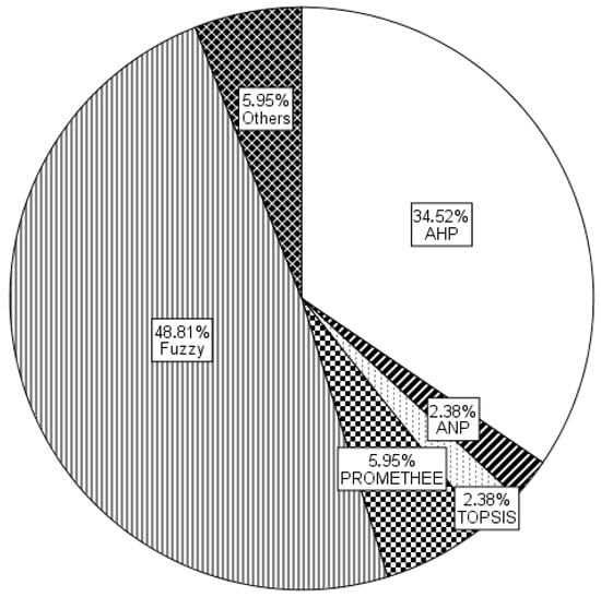 The 77 analyzed papers that use MADM were divided into four different phases of the bridge life-cycle (Figure 1). The planning and design phase and the construction phase have 19.48% and 9.09%, respectively. The operation and maintenance phase has 68.83%. This percentage is as high as it is mainly due to two reasons. First, this phase involves more qualitative criteria because there are a lot of visual inspection factors for assessing the condition of a bridge that are difficult to quantify. Therefore, this is a phase that lends itself to being analyzed using MADM. Second, this is the longest phase in a bridge’s life-cycle. While the operation and maintenance duration is commonly defined as 100 years or more, the other phases last less than 5% of the total lifetime. The demolition or recycle phase has only been studied in 2.60% of all papers. This phase was studied less as it is viewed as having a lower overall impact. Still, this phase should be taken into account in the decision-making process because decisions regarding demolition or recycling have to be made. Figure 2 shows the percentage of methods used in the different studies, considering both single and hybrid methods. Note that the methods most used are Fuzzy and AHP. These methods are typically joined together to form the most used hybrid method: Fuzzy AHP.