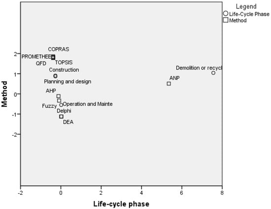 Figure 3 shows the interaction between the methods and the life-cycle phases of a bridge. This interaction represents the tendency of a method to be used in a phase; this tendency is greater when the method and life-cycle phase points are closer. Furthermore, a greater distance between the center and the related points implies a greater exclusivity.