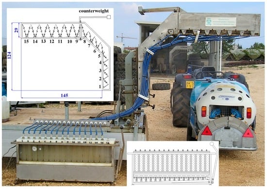 - Biocca, M.; Gallo, P. Comparison between horizontal and vertical lamellate patternators for air-blast sprayers. Open Agric. J. 2014, 8, 12–17. [Google Scholar] [CrossRef]