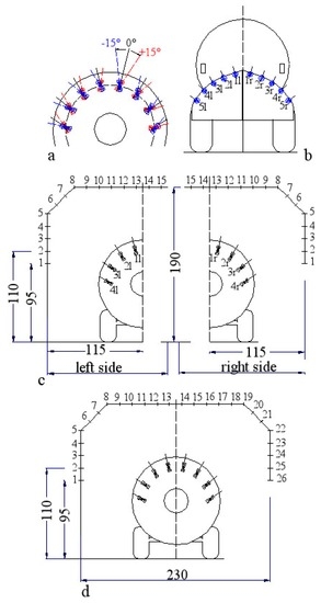 - C: clockwise rotation (+15°) of the four nozzle bodies placed on the right side and counter-clockwise rotation (−15°) of the four nozzle bodies placed on the left side (Figure 4a);