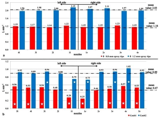 On the other hand, some drawbacks were pointed out during the evaluations of the flow rates discharged by the nozzles of the Carrarospray NTF600, caused by discrepancies among the measured flow rates and the corresponding ones outlined by the metal pointer on the graduated scale of the control system for both the diffusers. Furthermore, once again for both of the diffusers, the modification of the number of the switched-on nozzles caused fluctuations of the operative pressure and, therefore, adjustment of the flow rate valve was necessary to restore the pressure at 0.3 MPa. Nonetheless, the results pertinent to the flow rates discharged by the nozzles of the NTF600 are shown in Figure 5b. Considering the operative condition connected to Qmb1, at 0.3 MPa, the mean nozzle discharged flow rate was 0.47 L/min and all the nozzles, except 2l and 2r, marked with a star in Figure 4b, did not comply with the standard because they diverged from this value by more than 5%. The effective overall nozzles flow rate corresponding to Qmb1 was then 4.70 L/min. Instead, taking into account the operative condition corresponding to Qmb2, at 0.3 MPa, the mean nozzle discharged flow rate was 0.89 L/min and also in this case several nozzles (3 l, 1 l, 1 r, 3 r,4 r), marked with a star in Figure 4b, did not comply with the standard. The effective overall nozzles flow rate corresponding to Qmb2 was then 8.92 L/min. In conclusion, the flow rates produced by the nozzles of each diffuser of the tested mist blower sprayer have never been uniform in any selected operative condition.