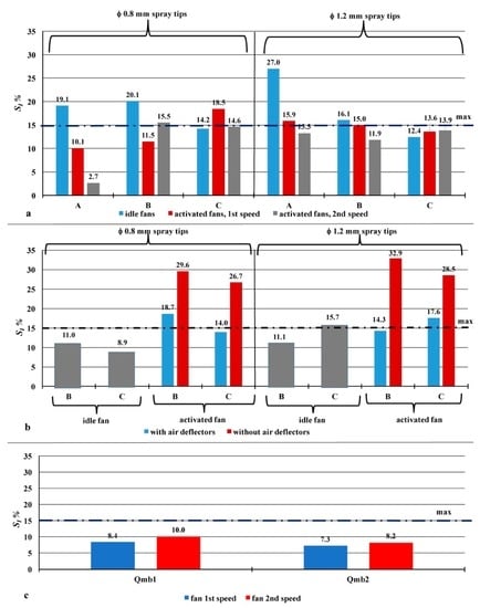 The indices SI pertinent to the Carrarospray ATP800 (single axial fan) are close or lower than the fixed limit when the fan is in the idle position. Considering the B case, i.e., –15° rotation of the nozzle bodies placed on the right side and +15° rotation of the nozzle bodies on the left side of the sprayer, the SI index is, respectively, 11.0% with the φ 0.8 mm tips and 11.1% with the φ 1.2 mm tips (Figure 6b). These values are lower than the corresponding ones registered with the Carrarospray ATD800: 20.1% (+83%) with the φ 0.8 mm tips and 16.1% (+45%) with the φ 1.2 mm tips (Figure 6a). These divergences are probably due to the different locations, reciprocal space, and basic orientation of the nozzle bodies on the arc-shaped booms of the two sprayers. Taking into account the C case, i.e., +15° rotation of the nozzle bodies placed on the right side and –15° rotation of the nozzle bodies located on the left side of the sprayer, and considering once again the fan in the idle position, the SI index pertinent to the ATP800 becomes, respectively, 8.9% with the φ 0.8 mm tips and 15.7% with the φ 1.2 mm tips (Figure 6b). This is probably due the same aforementioned reasons. Additionally, these values are not comparable with the corresponding ones registered with the Carrarospray ATD800: 14.2% (+60%) with the φ 0.8 mm tips and 12.4% (−21%) with the φ 1.2 mm tips (Figure 6a).