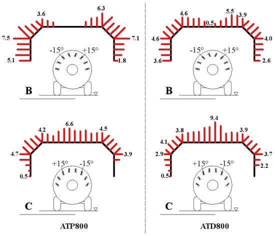 The trend of the spray profiles of the two sprayers, concerning the C configuration, i.e., +15° rotated nozzle bodies placed on the right side and −15° rotated nozzle bodies located on the left side of the sprayer, are comparable even if the respective amount of spray along the traits of the patternator are different (Figure 8). Both the distribution profiles highlight a noticeable lowering of the quantity of spray along the vertical traits of the patternator, on average 18.1% for the Carrarospray ATP800 and 14.6% for the Carrarospray ATD800 of the total. Again, it should increase the foliar spray deposition in the adjacent rows, when not intercepted by the grape bunches. Along the oblique traits, the spray is, on average, 27.9% for Carrarospray ATP800 and 22.8% for Carrarospray ATD800 of the total and, finally, along the horizontal trait, the quantity of liquid is respectively 54.0% (Carrarospray ATP800) and 62.6% (Carrarospray ATD800).