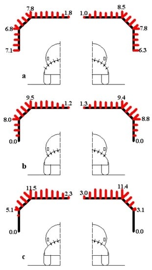 Conversely this diagram highlights amounts of liquid collected by the intercepting tools placed downward (1 and 2 in Figure 4c) that are linked to “off-target” losses, and this drawback has suggested to search for the responsible nozzles among the 5 + 5 switched on. Therefore, the spray diagrams produced by each nozzle, one by one switched on, allow for affirmation that the nozzles 5l and 5r (Figure 4b) would be responsible of the “off-target” losses and the leakage of mixture during the treatments. As a consequence, the employment of 4 + 4 nozzles or at most 3 + 3 nozzles simultaneously switched on, would eliminate these losses as shown, respectively, in Figure 9b,c.