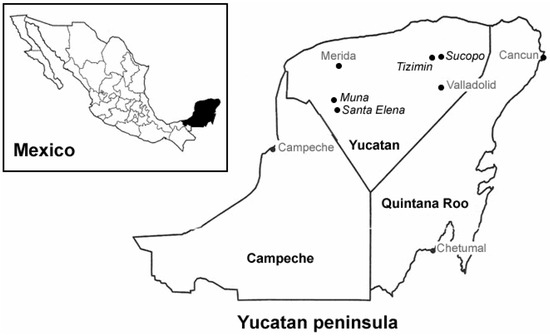 Map of the Yucatan peninsula and the study sites in the state of Yucatan.