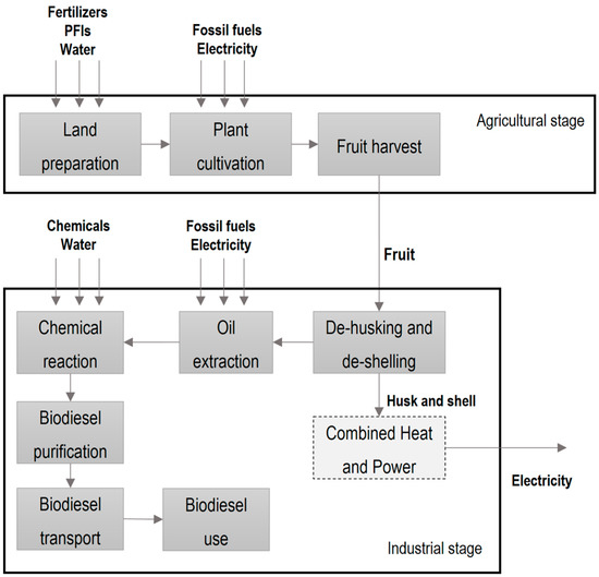 An LCA quantifies the potential environmental impacts caused by all stages in the life cycle of a product, based on the inputs and outputs of energy and materials to and from each stage. The life cycle of a product is the sequence of all processes (or stages) needed to extract and transform all raw materials (in this case, jatropha fruits, fertilizers, pesticides, water, electricity, and others) into the final products (biodiesel and electricity), including the usage stage (i.e., burning the biodiesel in engines) [29,41]. The stages included in this analysis were (a) an agricultural stage, including the processes of land preparation, plant cultivation, and fruit harvest; and (b) the industrial stage, including the processes of materials transport and processing, product manufacturing, distribution and use, and end-of-life disposal or recycling (see Figure 2). For liquid biofuels, this is known as a well-to-wheels (or cradle-to-grave) system boundary [42]. For comparison purposes, two scenarios were assessed: first, a base scenario (S1) where the only valuable product is biodiesel produced from the jatropha oil, and the remaining streams are either considered by-products (such as the press cake, which is sold as a soil amender, and the crude glycerin, which is sold as it is after the chemical reaction process) or residues (hull and husks, which are lignocellulosic biomass left over from the extraction of the seed oil). In the alternative scenario (S2), all the lignocellulosic residues (husk and hull) and the press cake are transformed into steam and electricity, so that biodiesel production is energetically self-sufficient (i.e., without the need for external energy sources) and the excess electricity is injected into the public grid. In all cases, it was assumed that the plantations could maintain a constant seed yield of 2000 kg∙ha−1∙a−1 for 20 years.