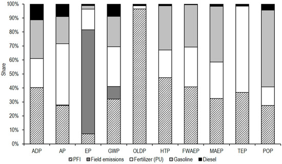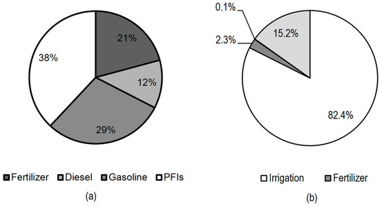 Figure 6a shows the distribution of the fossil energy consumed by the agricultural stage. PFIs contribute the most to energy consumption (38%), followed by gasoline (29%) and fertilizers (21%). Other studies differ from these results in that they report that fertilizers are the major contributor to fossil energy consumption [53,57,58]. The difference arises because they considered both higher fertilizer requirements and lower or even null PFI inputs for the agricultural stage.