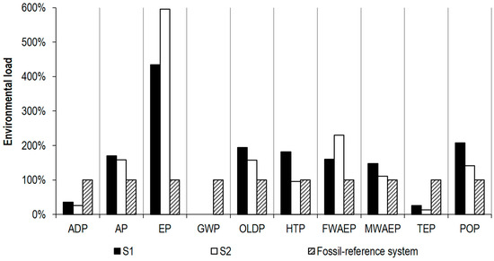 The potential reduction of environmental impacts of the biofuel system can be estimated by comparing them to the corresponding emissions of the reference system. The potential reductions (as a percentage) in all environmental impact categories are plotted in Figure 4. In this figure, relative emissions are expressed as a percentage of the fossil reference system; values lower than 100% indicate savings, while values higher than 100% occur when the emissions of the biofuel system are greater than those of the fossil system.