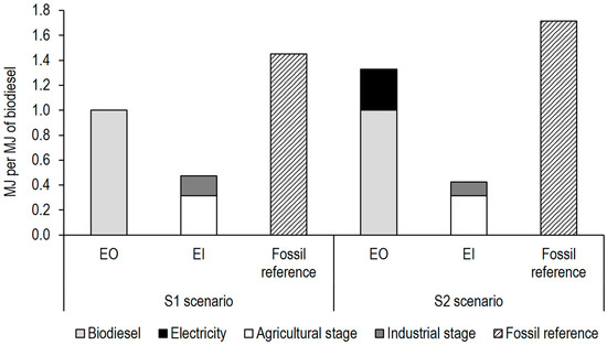 Figure 5 shows how the energy produced, or energy output (EO), is distributed among the energy products of the biofuel system (biodiesel and electricity). A second bar shows how the fossil energy demand, or energy input, is split between the two stages of the production process (agricultural and industrial). The third bar represents the fossil energy demand in the fossil reference system. The difference between the last two bars represents the savings that the biofuel system can provide with respect to the fossil alternative. The agricultural stage contributes the most to the fossil energy demand (66% in S2 and 75% in S1). The biodiesel represents the highest share of energy output. In fact, the energy provided by the biodiesel alone is enough to reach a FER of greater than 1. The FER values attained indicate that the proposed biofuel system returns about 2–3 times more renewable energy than the fossil energy it demands.