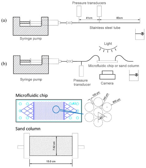 Experimental configuration. (a) Foam viscosity measurement. The inner diameter of the stainless steel tube is 0.533 mm; (b) Breakthrough pressure measurement in the microfluidic chip and sand pack. The overall dimension of a microfluidic chip is 21.3 mm × 12.7 mm, and the thickness of channels (pore depth) is 50 μm. The hydraulic conductivity of the microfluidic chip is ~0.01 mm/s.