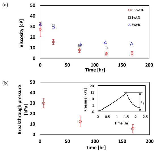 For the foam generated with the 0.5 wt % solution, the viscosity measurement was repeated five times at time = 0.2, 24, 72, 121, and 169 h after the foam generation, and only one viscosity measurement was conducted for the 1 wt % and 2 wt % solutions at the same time condition. As shown in Figure 2a, the viscosity of the foam decreased with increasing time. For the 0.5 wt % solution, the viscosity decreased from η = 27 cP to η = 7 cP during the initial 72 h, and thereafter it dropped very slowly down to η = 4.4 cP at t = 167 h. Note that the water viscosity was η = 0.89 cP at T = 297 K and atmospheric pressure condition [50].