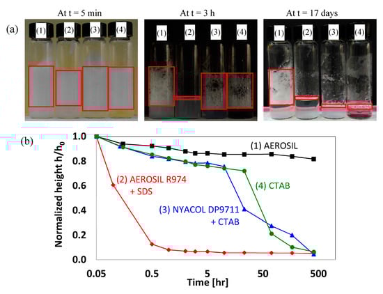 Foam stability identified by the height of foams as a function of time was dependent on nanoparticle type and the presence of surfactants (Figure 3). The foam produced from the AEROSIL R974 solution had the highest stability among the four types of solutions. The height of the foam generated from the AEROSIL R974 solution was maintained over 80% of the original height even after 17 days. However, if the surfactant (0.1 wt % of SDS) was added to the AEROSIL R974 solution, the foam stability was dramatically reduced. The foam height of the solution dropped down to 10% of the initial height within 30 min. This may have been because the wettability of the nanoparticles in the AEROSIL R974 solution was modified to be strongly hydrophilic due to the SDS surfactant adsorption onto the nanoparticle surface [2,29]. Once the surface of nanoparticles became hydrophilic after the SDS surfactants were adsorbed on the nanoparticle surface, the foam stability decreased.