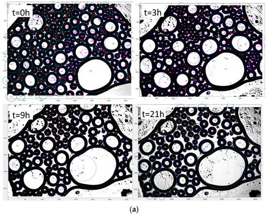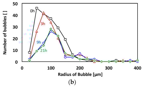As shown in Figure 4b, initially the most frequent radius of bubbles was 50 μm, and few bubbles larger than 300 μm were also observed. The total number of bubbles was N = 190 at the initial observation. At time = 3 h, the total number of bubbles decreased down to N = 144, and the most frequent radius increased to around R = 75 μm. The maximum radius was R = 340 μm. At the time of 9 h after the foam generation, the total number of bubbles was N = 95 and the most frequent radius increased up to R ~ 100 μm. The maximum radius increased to R = 370 μm. This phenomenon can be explained by bubble coalescence and the Ostwald ripening effect in which larger bubbles continue to grow at the expenses of smaller bubbles. Based on the analysis in Figure 4, the size of bubbles smaller than R = 100 μm decreased and some of the small bubbles disappeared, and bubbles bigger than R = 100 μm continued to grow in their sizes. Additionally, at time = 21 h, the total number of bubbles reduced by only three (N = 92), and the most frequent radius was maintained at R = 100 μm. The maximum bubble radius was R = 400 μm.