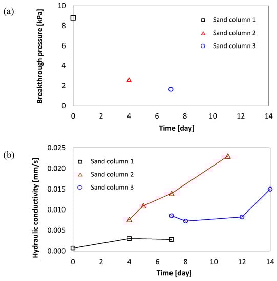 Figure 5 shows the breakthrough pressure and the hydraulic conductivity evolution after breakthrough. The breakthrough pressure decreased with increasing time, which was also shown in the microfluidic chip test. The breakthrough pressure dropped quickly during the first four days and then decreased slowly. Actual values of the breakthrough pressure of sand columns were smaller than those of the microfluidic chip. This was because (1) the size of pore throats was smaller for the microfluidic chip than the sand column (a small pore throat limits the mobility of gas bubble; higher pressure is required for gas bubble to pass through a smaller pore throat); and (2) a three-dimensional sand column may have a heterogeneous pore size distribution so that the water may have had a better chance to find the drainage path at lower water pressure.