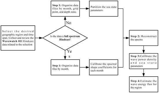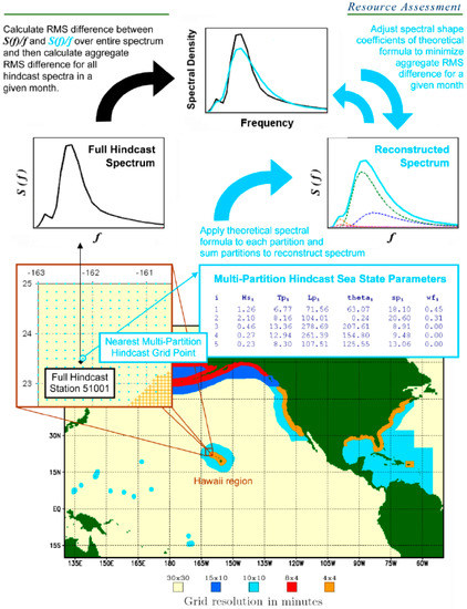 In this step, the overall spectra can be reconstructed using the spectral shape parameters calibrated in previous steps, as Equation (9). By using the two data inputs (the hindcast sea state parameter data and the spectral shape coefficient data) for each partition in the given region, the spectra and the sea state parameters can be calculated in step 4 for each time step in a given month. If the time period of interest is 12 months, then there would be approximately 2920 hindcast time steps (the time interval is 3 h) on each grid point. The overall number of reconstructed overall sea state spectra during a 12-month period will then be equal to 2920 times the number of grid points in the region of interest. This reconstruction process is depicted in Figure 2.