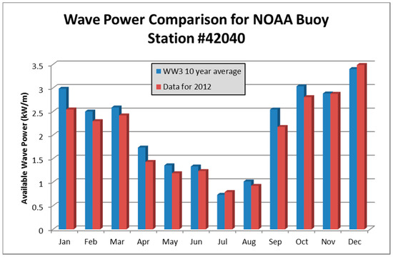 Ten-year means of the wave energy for National Oceanic and Atmospheric Administration’s (NOAA’s) buoy station #42040 with wave height (Hs) = 1.1 m and peak wave period (Tp) = 5.7 s.
