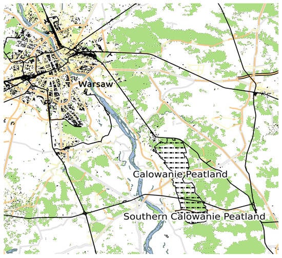 The selected research area of 588.8 ha is the Southern Całowanie Peatland, which has already been under protection as a habitat for endangered wetland species of flora and fauna for about 10 years. It is located 35 km south of the capital city of Warsaw, and constitutes only part of a large wetland complex that covers a wide extent of the Valley of the Vistula River. The whole Całowanie Peatland (total area of 3500 ha) forms a vast and interrelated system (Figure 1), containing valuable landscape components such as raised and transitional bogs and single-swath meadows—the biodiversity of which strongly depends on human maintenance and which have been claimed to be one of the most vulnerable habitat mosaics in Europe [5,7].