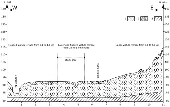 Geological cross-section of the Vistula Valley and the study site, where 1 stands for sand, 2—peat and riverine silt, 3—silty loam.