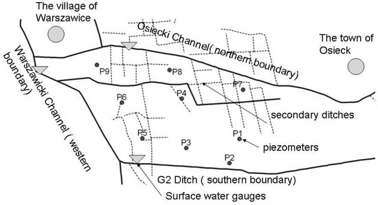 The study site is bounded from the north, south, and west by main drainage irrigation channels, which served in the past to supply water to secondary ditches within the area [7]. Those ditches have had limited maintenance, and were finally overgrown with vegetation. The present physical condition of the system enables the surface water levels to be adjusted only in the main surrounding channels.