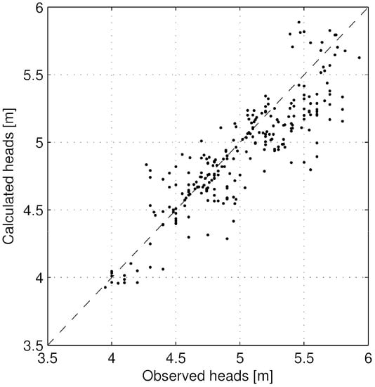 A calibration process was performed using a trial and error procedure in order to estimate such values of aquifer conductivity and eastern inflow rate for which a reasonable match between modeled and observed ground water levels was achieved. Ground water levels used for calibration were measured in the network of piezometers in 2012, and surface water levels in channels were gauged in that year as well. Moreover, they were expressed in meters above the mean Baltic sea level datum. Based on geological surveys, reasonable assumed values of hydraulic conductivity of the aquifer varied from 16 to 30 m/day, while the ground water inflow rate applied on the eastern boundary ranged from 0.5 to 2.1 m3/day/m [5]. Both parameters were changed individually, followed by a visual comparison of observed and modeled piezometer heads (Figure 4), correlation coefficient, and standard deviation. The conductivity and inflow values were finally considered as acceptable when standard deviation reached 0.3 m and correlation coefficient was equal to 0.82. As a consequence of the calibration procedure, aquifer conductivity was set as 25 m/day and eastern flux equal to 1.7 m3/day/m.
