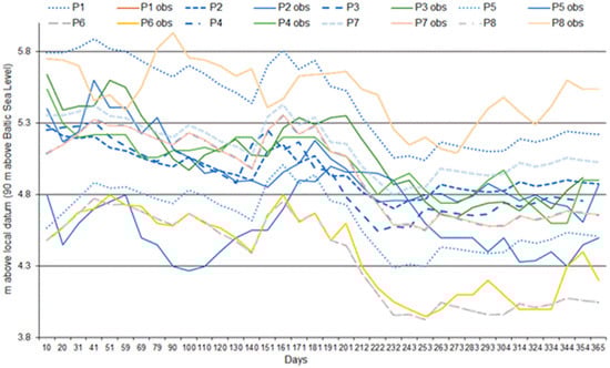 Next, the model was validated on the basis of ground water levels measured throughout 2013. In the simplest manner, we estimated the quality of the model by visual comparisons (Figure 5) and also by calculating correlation coefficients between modeled and observed water tables for all piezometers. The achieved values (0.6–0.79) do not indicate good or very good quality, but rather suggest a satisfactory (or acceptable) one.
