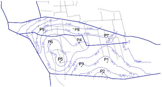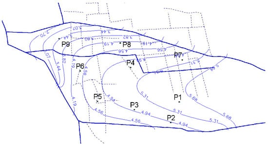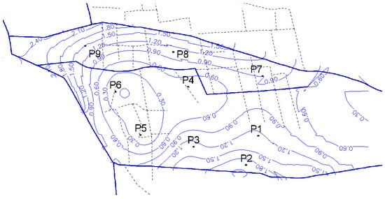 Ground water levels, modeled with decade time step, were averaged for 2014 (Figure 6) and subtracted from terrain elevation (Figure 7). In this manner, mean ground water depths were determined. In the first scenario, which reflected the current status of the system, mean ground water depth varied from 0.3 to 0.9 m in the middle of the area, and near the canals it ranged from 0.9 to 2.4 m. We found that the calculated depth followed patterns typical for areas surrounded by drainage-irrigation channels. Maximum depth values were noted close to channels, while in the middle of the area, near piezometers P4, P5, and P6, they approached land surface elevation.