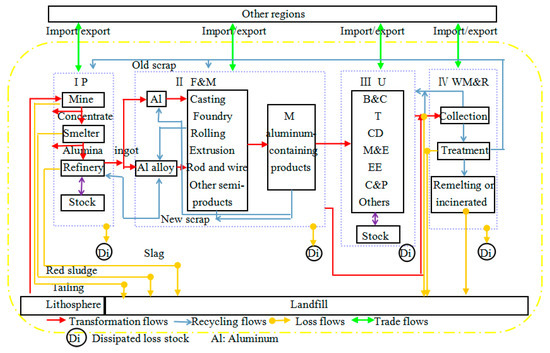 A considerable amount of information such as development situation, consumption, trade, recycling, and loss of aluminum industry can be obtained from SFA. Consequently, the information provide a base and support to design and make resource policies; many research fields are involved in the following: (1) analysis of quantities in the entire system—Chen researched the whole life cycle of aluminum including production, trade, consumption, stocks, and losses using the SFA method [8,9,10,15,29]; Buchner analyzed Austrian aluminum flows in 2010 using a static SFA model and conducted extensive research on aluminum production, consumption, trade, and waste management [30]; (2) recycling and sustainability—Melo developed several models (statistical approaches) for estimating the potential scrap arising from discard metal-containing products to predict the amount of aluminum old scrap in the waste management stage in Germany [31]; Boin and Bertram carried out mass balance analysis in the aluminum recycling industry for the EU-15 in 2002 [32]; Hatayama et al. reported a dynamic SFA of aluminum and its alloying elements in Japan to estimate future quantities of discarded aluminum in each of the eight categories using a population balance model [33]; (3) combining with other aspects such as value chain and environment; Dhalström analyzed aluminum flows in the United Kingdom in 2001 combining SFA with economic and environmental dimensions to create a value chain analysis [34]; Gang developed a dynamic SFA model to simulate the stocks and flows of the U.S. aluminum cycle and analyze the corresponding greenhouse gas (GHG) emissions [13]. Of course, this wonderful methodology was also conducted to research other metals, such as copper [35,36,37,38,39,40], nickel [41], zinc [39,42,43], iron [26], lead [44,45], silver [46], phosphorus [47,48], and so on. In recent years, this method has been applied at a more micro level, and used to measure the recovery rate, recovery amount, and recovery potential of a certain kind of product within a region or a small area [49,50,51,52,53,54].