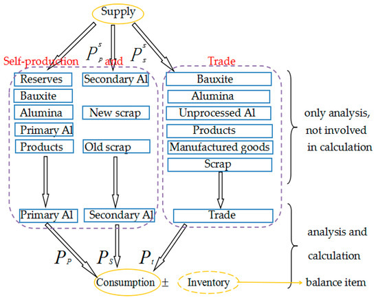 Aluminum supply in China can be classified into five parts: primary aluminum, secondary aluminum, trade, overseas investment on bauxite, and substitute goods. However, overseas investment has not formed an effective support to China’s aluminum industry [55], and the proportion of substitute goods of aluminum or aluminum alloy are so small that they can be ignored. Therefore, the supply structure of China’s aluminum in this paper is the proportions of the former three parts taking up the domestic consumption plus “inventory”. Each part also possesses several sub-classifications (Figure 2). The “inventory” is just the balance of supply and consumption, and does not have much practical significance.