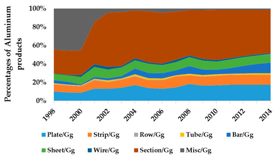 There are nine aluminum products (plate, strip, row, tube, bar, sheet, wire, section, and miscellaneous) illustrated in Figure 4, and the proportions of these products are distinct. In 2014, the most significant proportions are section, plate, and bar, which are 45.3%, 16.8%, and 10.8%, respectively, but the smallest proportions are row, wire, and tube, which, respectively, are 0.4%, 1.2%, and 1.7%. The largest change is in miscellaneous, from 44.3% in 1998 to 1.3% in 2014; the next is section, from 26% in 1998 to 45.3% in 2014; the third is bar and plate, from 3.2% and 10.4%, respectively, in 1998 to 10.8% and 16.8% in 2014. There are no obvious changes in the proportions of other aluminum products. For further analysis, the amounts of all products increased dramatically on the whole; the average annual growth rates were 28.6%, 26.9%, 38.4%, 38.1%, 45.9%, 25.6%, 50.4%, and 28.6% (except miscellaneous, only 8%) from 1998 to 2014. At the same time, the growth rate of miscellaneous in 2014 is −2.6% in comparison with the year 1998. Although the decrease in amount of miscellaneous was only 2.6%, its occupied proportion of total aluminum products dropped markedly. This is because production of miscellaneous underwent no significant change in these years, but the production of other products increased rapidly.