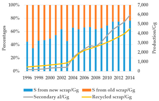 The supply situation and structure of secondary aluminum from 1996 to 2014. “S from new scrap” represents secondary aluminum from remelted new scrap; similarly, “S from old scrap” represents secondary aluminum from remelted old scrap (data source: WBMS [56]).