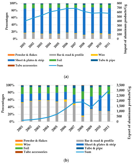 The aluminum products through international trade contain powder & flakes, bar & road & profile, wire, sheet & plate & strip, foil, tube & pipe, and tube accessories. The total imported quantity of aluminum products has been increasing steadily since 2001, reaching a maximum in 2007, then gradually dropped and still had a tendency to drop in the future. While the exported quantity increased on the whole from 2001 to 2011, with an average annual increase rate of 33.1%, it still had a tendency to increase in recent years. As we can see in Figure 7a, the proportions of varieties of imported aluminum products have not changed much. The largest proportion of total imported aluminum products is sheet & plate & strip, from 68% in 2001 to 72% in 2011; the next are bar & road & profile and foil, from 16% and 12% in 2001 to 12% and 10% in 2011, respectively. However, the change of export structure of aluminum products is rather complicated. In 2001, the largest ratio of total exported aluminum products is bar & road & profile, the next are sheet & plate & strip and foil, with ratios of 51%, 23%, and 19%, respectively; nevertheless, in 2011, the largest ratio was sheet & plate & strip, followed by bar & road & profile and foil, with ratios of 47%, 28%, and 21%, respectively. In addition, there are two points to be recognized: (1) the ratio of exported tube & pipe remained below 5% in 2001, but increased to 16% in 2008; (2) the ratio of exported wire remained below 2% in 2001, but increased to 5.6% in 2006. Although the exported quantities of other aluminum products grew quickly in this period, the quantitative base is very small comparison with sheet & plate & strip, bar & road & profile and so on, so the ratios of them on the total exported quantity are also small. Moreover, the influence of the international financial crisis in 2008 on aluminum product export is obviously great, and the export structure has changed significantly.